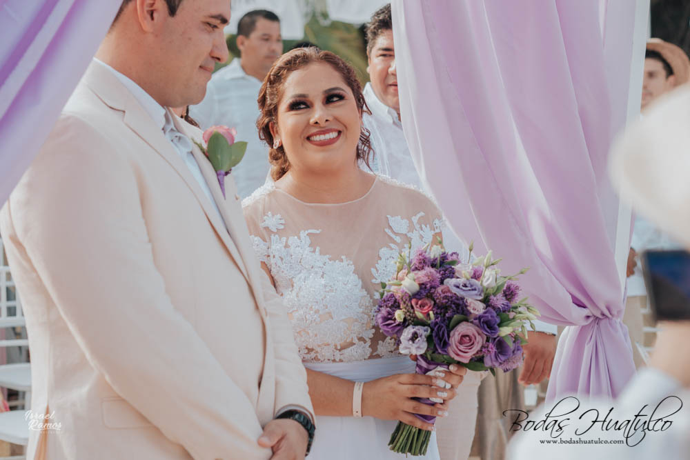 El día de la boda había llegado la ceremonia se llevo a cabo en la playa el Tornillo de Las Brisas, el color tema de la boda fue el lila.
